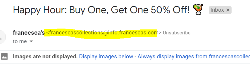 2. Open the email and identify the from: address. Bonus: You can also unsubscribe if you don't want the emails anymore. Copy the address.