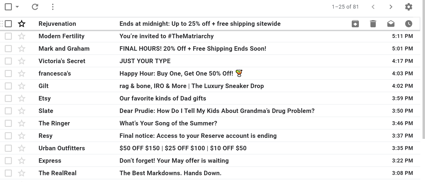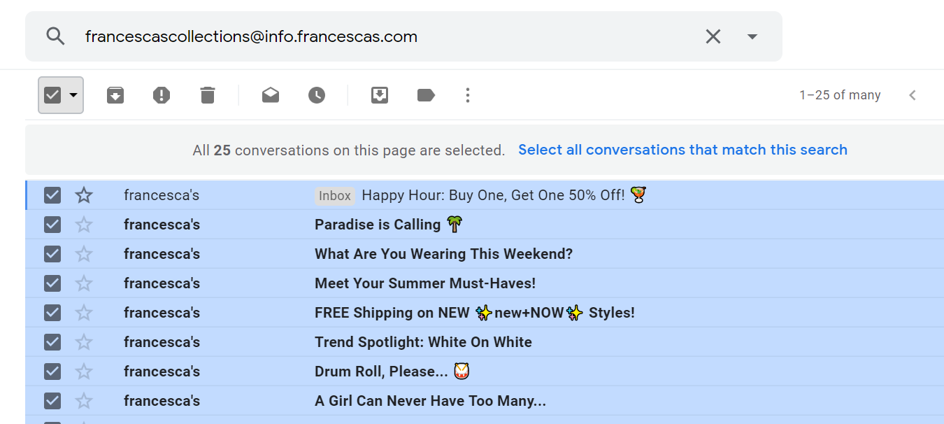 1. Looked at my All Mail to find low-value emails I no longer cared about. For this example, I'll choose Francesca's.