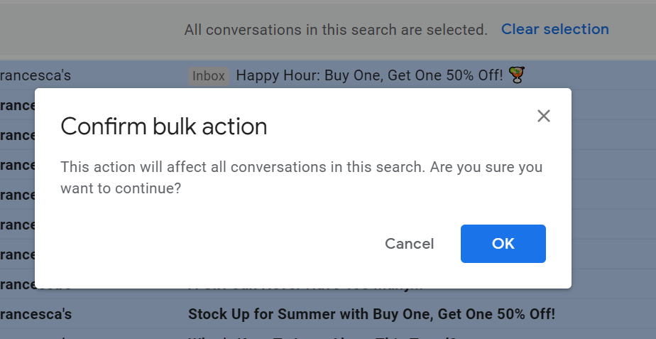 4. Select the trash can, it will warn you that you're about to perform a bulk action. Click OK. Those emails do not spark joy!